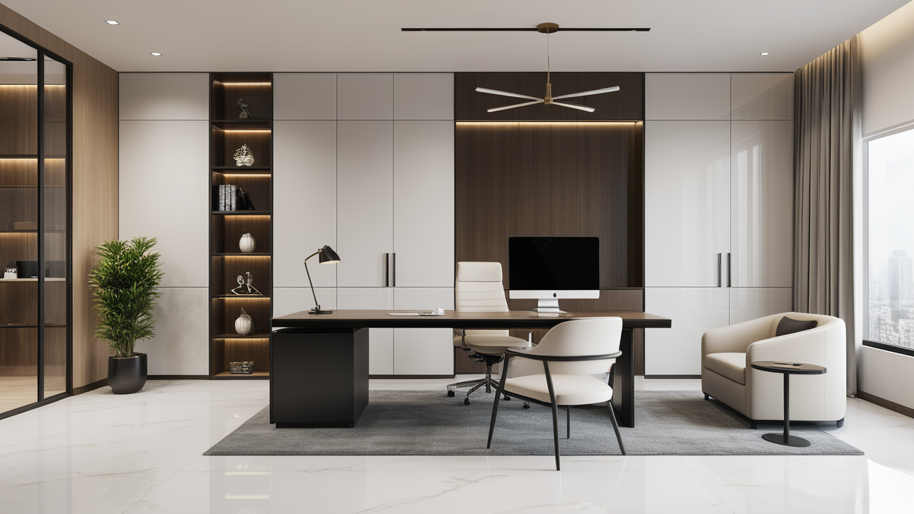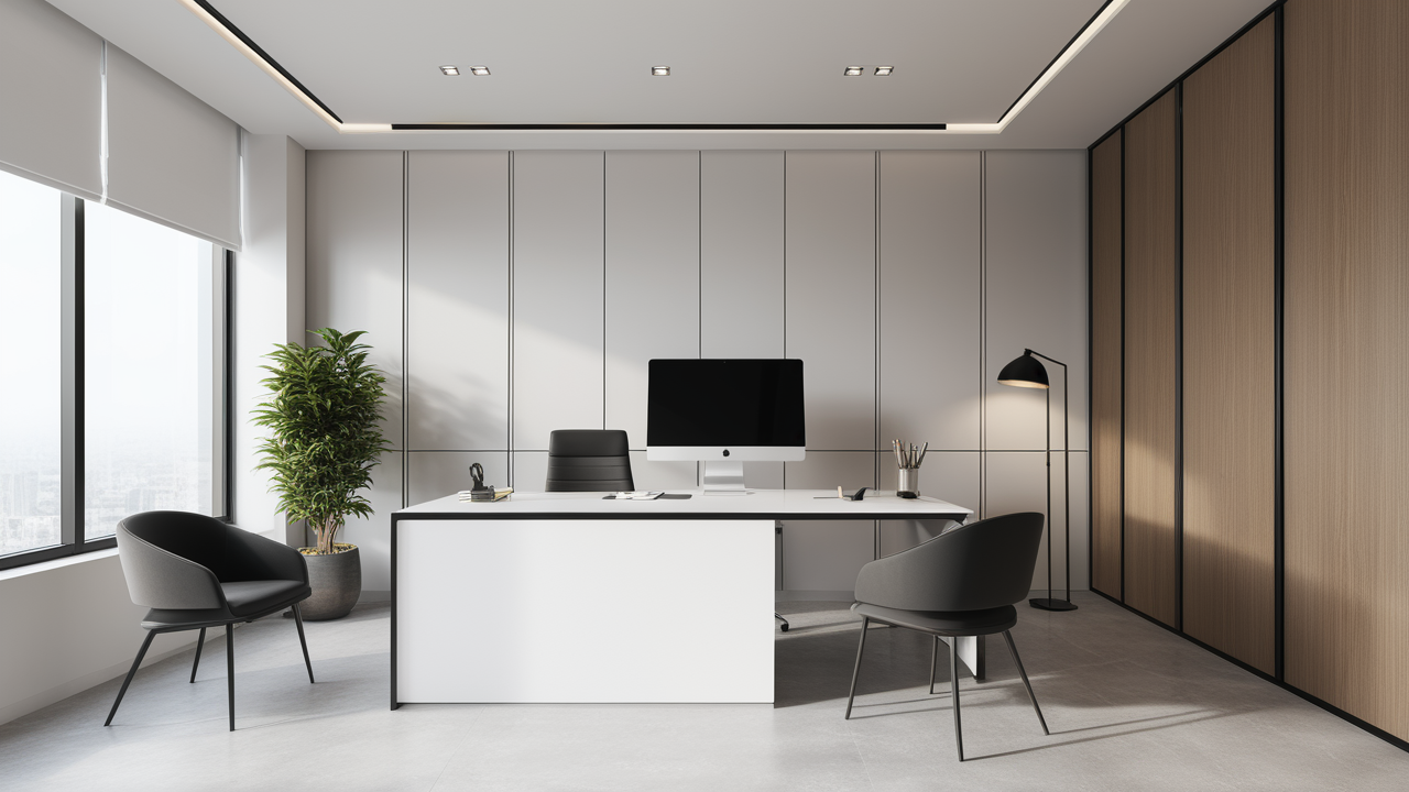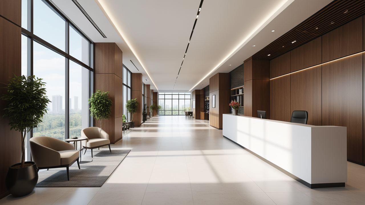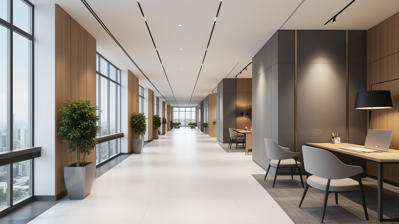 本案設(shè)計(jì)為突顯建筑開(kāi)間較舒適之優(yōu)點(diǎn),設(shè)計(jì)師特意設(shè)計(jì)了過(guò)道各柱體間鑲嵌不銹鋼條及玻璃幕墻上的磨砂條來(lái)點(diǎn)綴的裝修主題,同時(shí),地面用拼花色帶打破,與方正而美觀的吊頂上下呼應(yīng);辦公室靠近走道的墻面,為將自然光透入走道,同時(shí)又加強(qiáng)其“靈透”感,采用清玻幕墻,幕墻上的磨砂條既打破了玻璃墻面的呆板,又提醒了行人幕墻的存在,防止無(wú)意識(shí)碰頭、沖撞等類(lèi)似意外發(fā)生;為辦公室的后續(xù)私密性考慮,其清玻幕墻內(nèi)掛以百葉窗遮擋既可。
