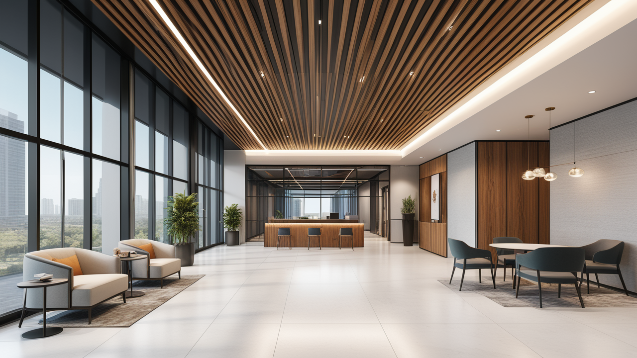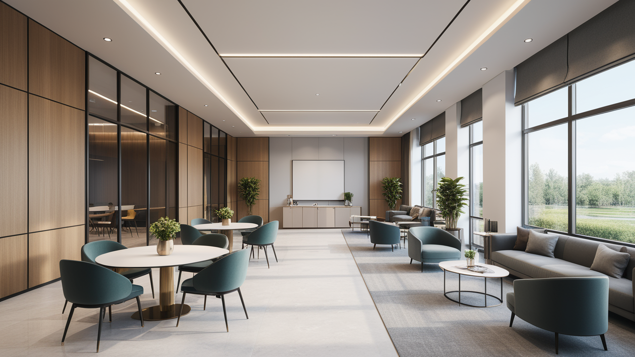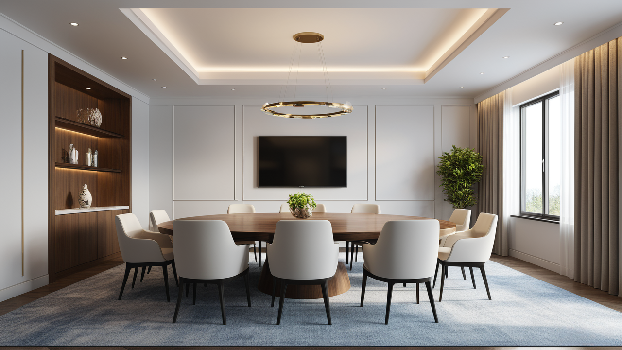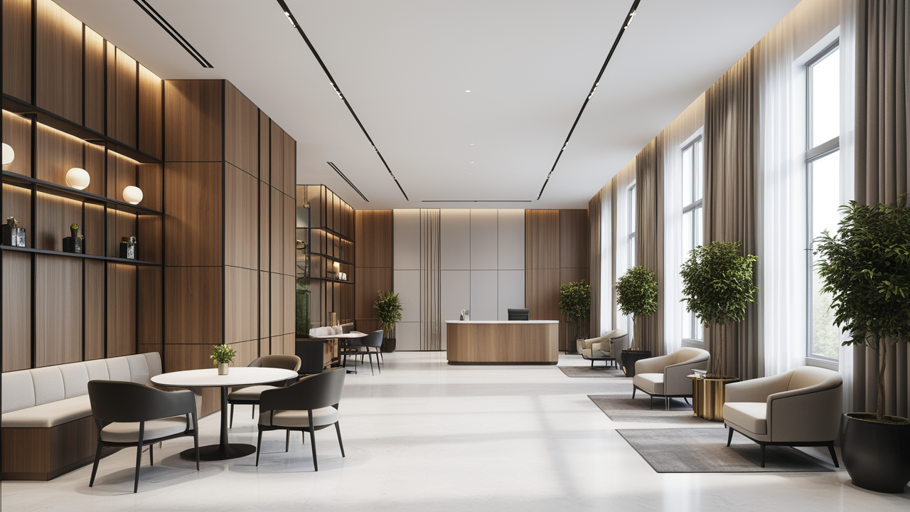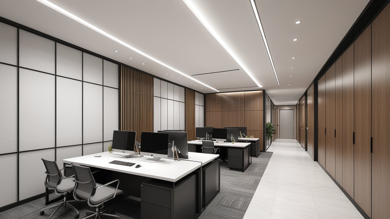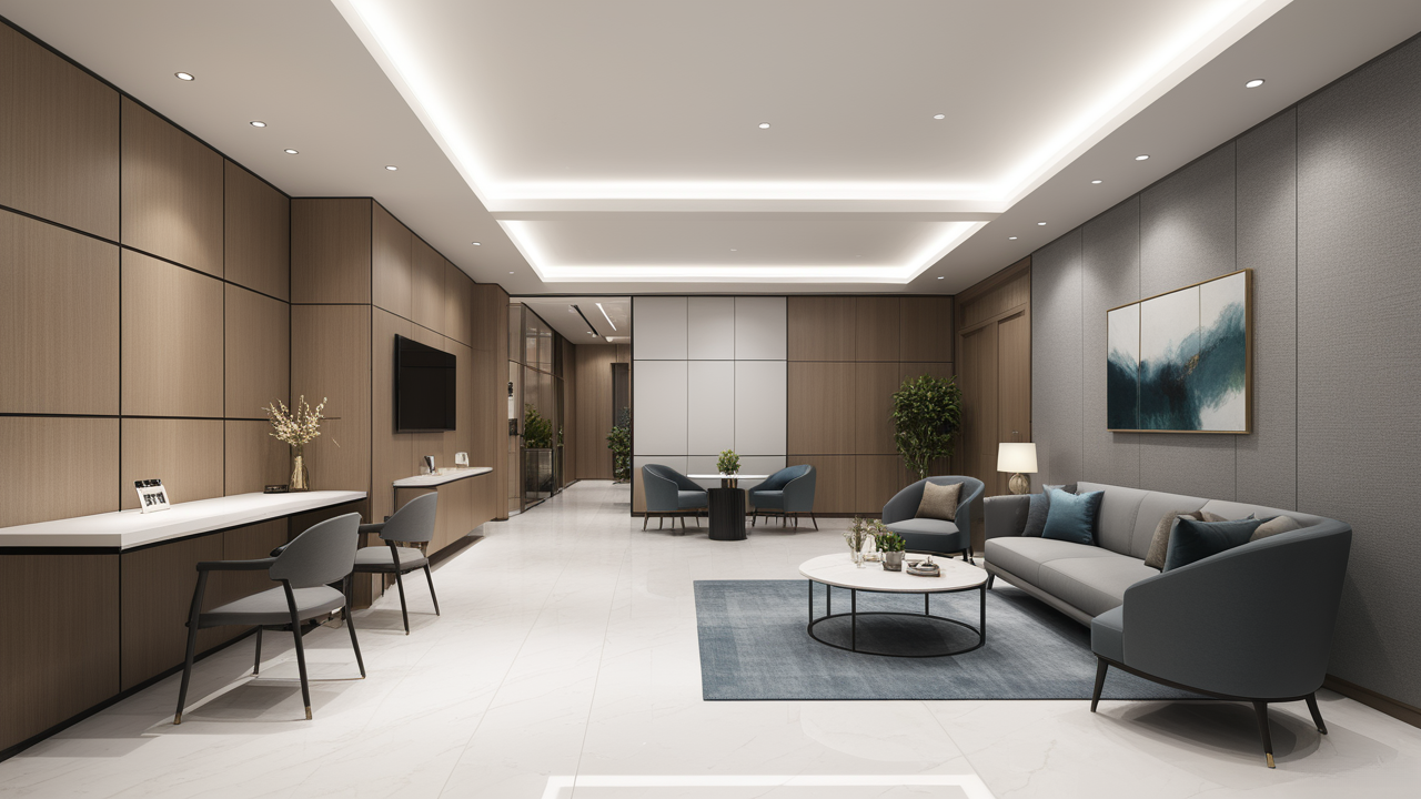 本案設(shè)計(jì)在處理上,特設(shè)計(jì)了可向客戶展示企業(yè)榮譽(yù)品的展示墻,用料實(shí)際,無(wú)須雕琢張揚(yáng),直線條的造型讓整個(gè)空間顯得穩(wěn)重大方,淺色系材料的運(yùn)用延續(xù)了靈動(dòng)而清澈的氣韻,大方莊重卻內(nèi)含現(xiàn)代時(shí)尚。而且色調(diào)淡雅的地毯、沙發(fā)、背景,還突出了接待廳親切、和睦、寬松的氛圍,使穩(wěn)靜而坦誠(chéng)的晤談氣氛盎然一室。
