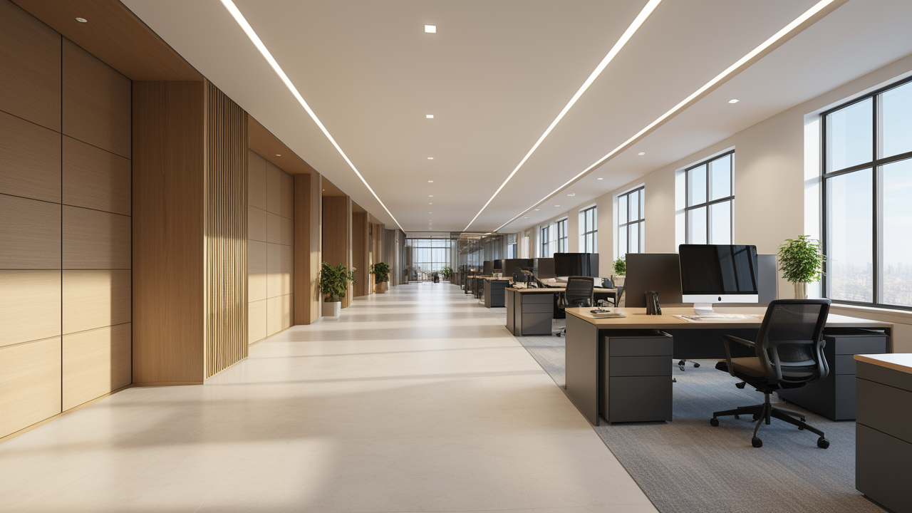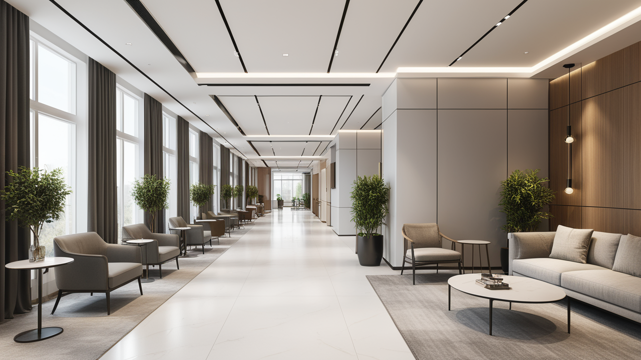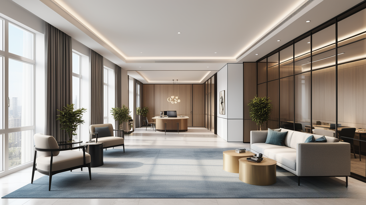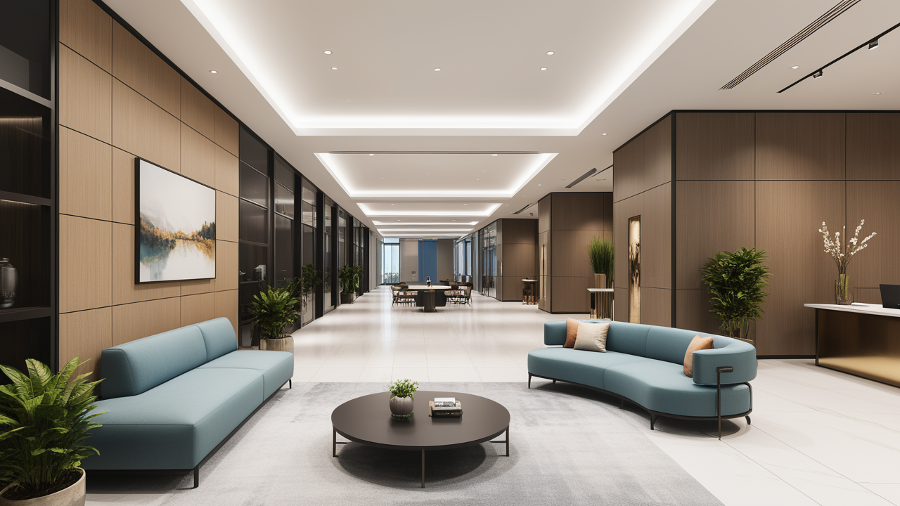 本案在設計中采用環(huán)環(huán)相扣的圓弧頂面造型,層層遞近的燈具圍繞圓型屋頂向外拓展,突出空間的立體造型感,也使天花燈飾顯出碧玉般通透潤澤的光影。設計成舞臺平臺的主席臺具備多功能的特點,可兼顧各類舞臺表演及大型會場會議的組織。粗曠沉穩(wěn)的圓形大立柱及方柱,頗具雄偉之勢,但是考慮到其在大型場地內的阻礙性問題,故不將此做再多修飾,僅僅以真石漆的噴涂來達到既不擴大柱圍又美化柱體的作用;地面以座位的安排為向導,輔以簡易直紋拼花來點綴。