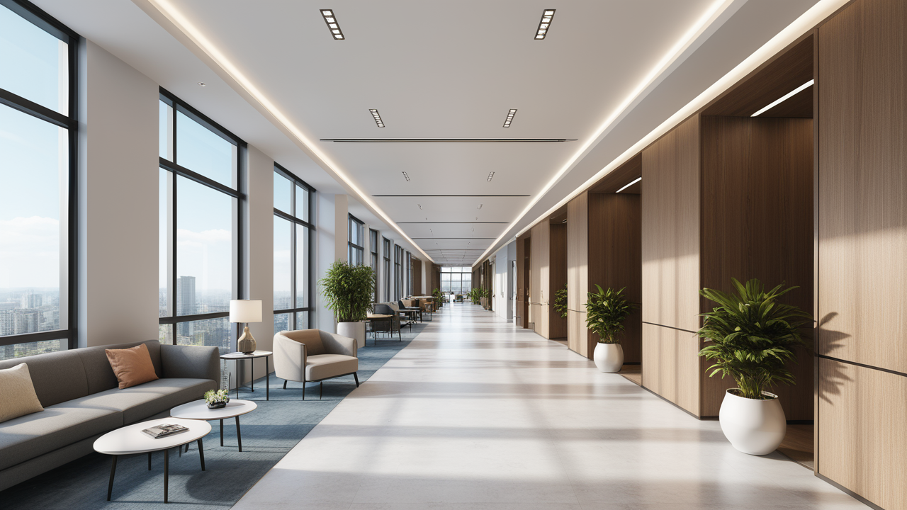 本案設(shè)計以簡潔的裝飾語言,對稱的空間布局,規(guī)范方整、功能健全,與環(huán)境形成交流,最終達成默契,突出了現(xiàn)代辦公環(huán)境講究效率的特征,整體風格簡約大方,符合公司的品牌形象和文化,同時也考慮到員工的舒適度和實際工作需求。這個辦公室裝修設(shè)計案例旨在為公司營造一個宜人的工作環(huán)境,提高員工的工作體驗和幸福感,從而推動公司的發(fā)展和成長。"