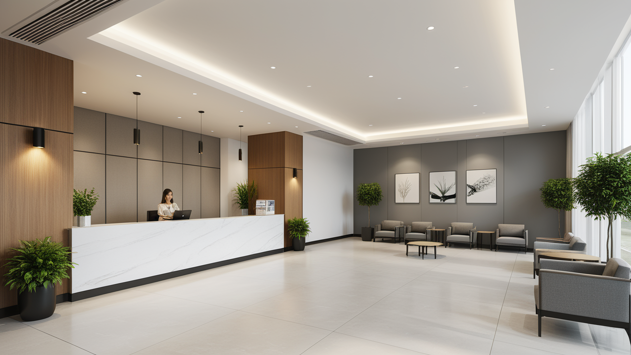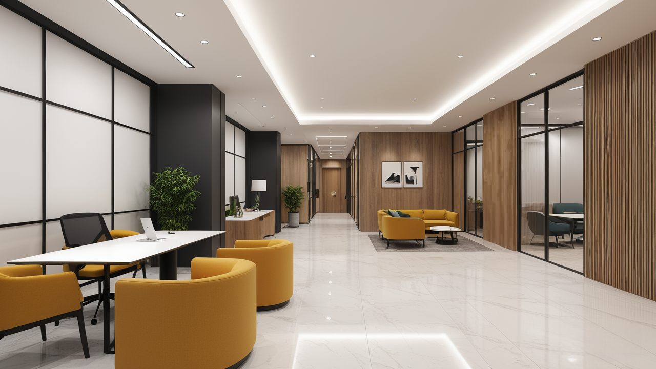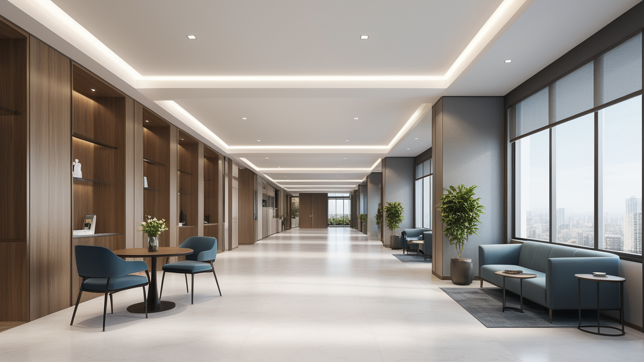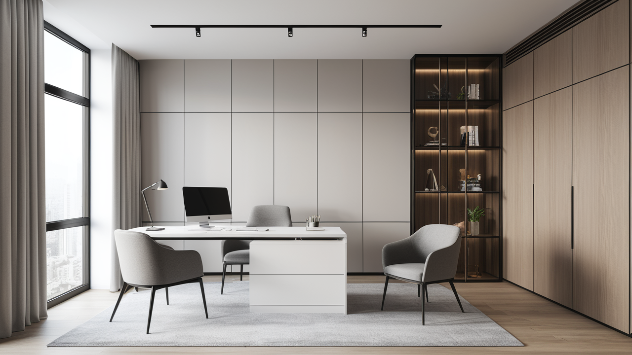 本案在這個辦公室設(shè)計中,甲方要求,有功能區(qū)設(shè)置,有總經(jīng)理,總經(jīng)理是本公司中最高的職務(wù),所以在我的設(shè)計中給他選擇了一個比較好的朝向,采光比較好、地面采用仿古顯紋復(fù)合強化淺色木地板。防滑耐磨。幾何式的辦公桌莊嚴(yán)不失人性化。自然的美巧妙的運用到設(shè)計之中,突顯對美好生活的向往。放松工作時的狀態(tài),副總經(jīng)理兩間,裝修風(fēng)格跟總經(jīng)理相符,比較統(tǒng)一。會議室,在平面功能上??紤]了合理的行動路線,東面墻對應(yīng)窗的位置設(shè)計了落地的玉砂玻璃隔墻,以滿足展示區(qū)的采光要求。