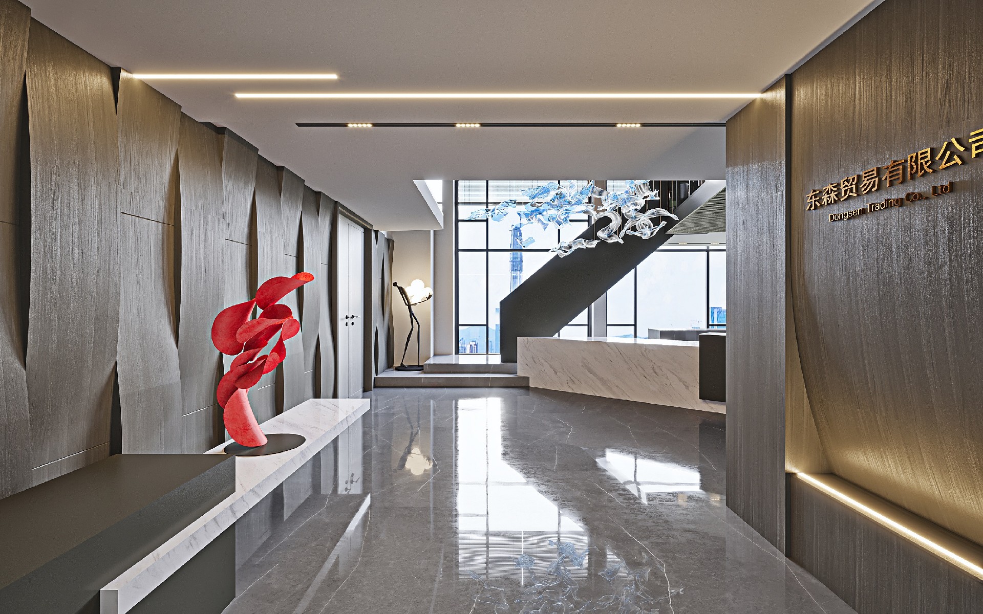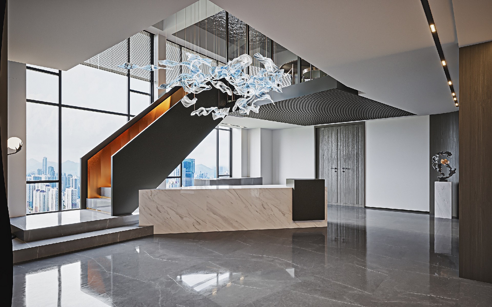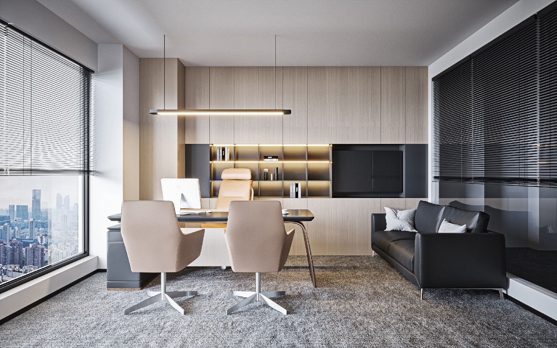 本案在設(shè)計(jì)中因?yàn)榭臻g較寬敞,加之衛(wèi)生間門的開向正對室內(nèi),特設(shè)計(jì)了展示性隔斷柜,加強(qiáng)其辦公、會客及生活的區(qū)域性,既做到了空間上的劃分,又可通過展示柜內(nèi)的擺設(shè)輔助室內(nèi)布置呈現(xiàn)事業(yè)風(fēng)貌及個人雅興,體現(xiàn)其穩(wěn)重而時尚的人性化的特點(diǎn)。