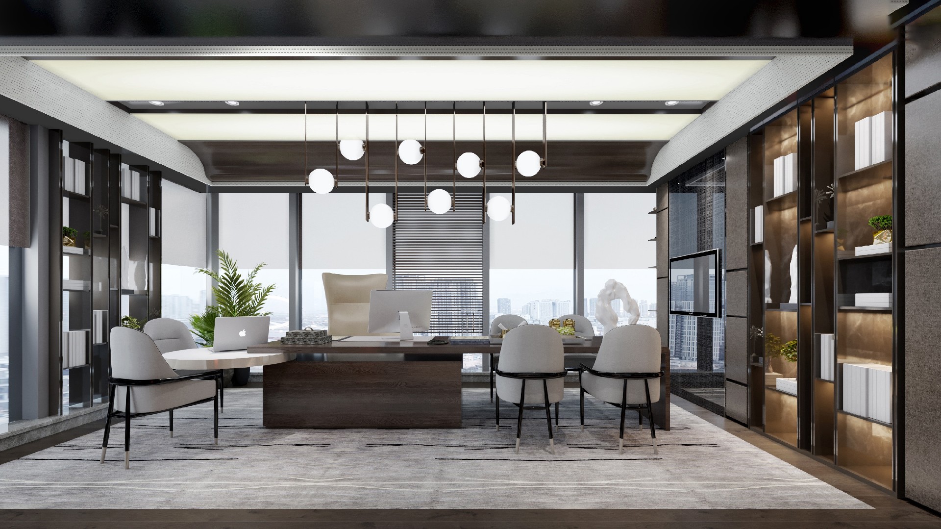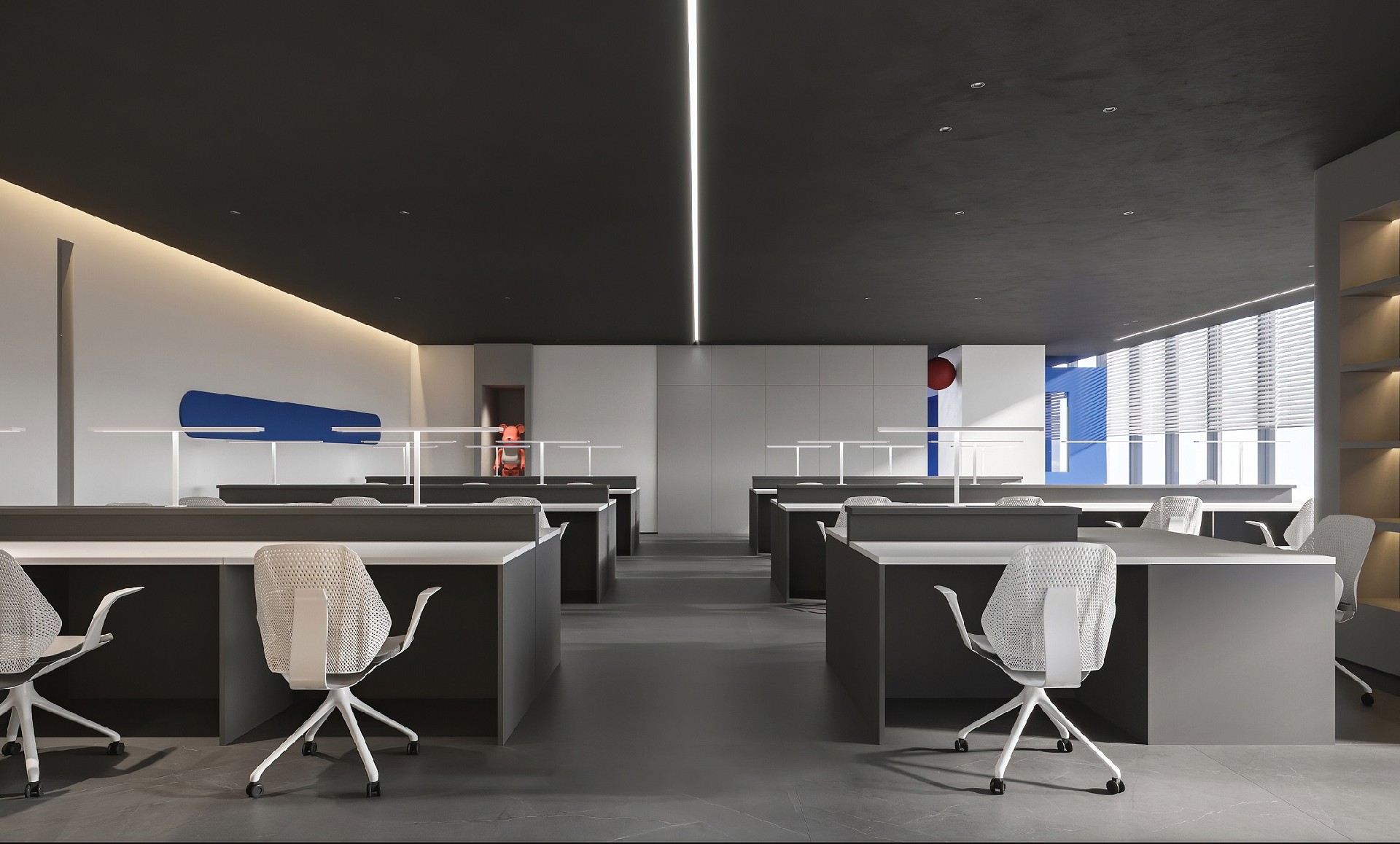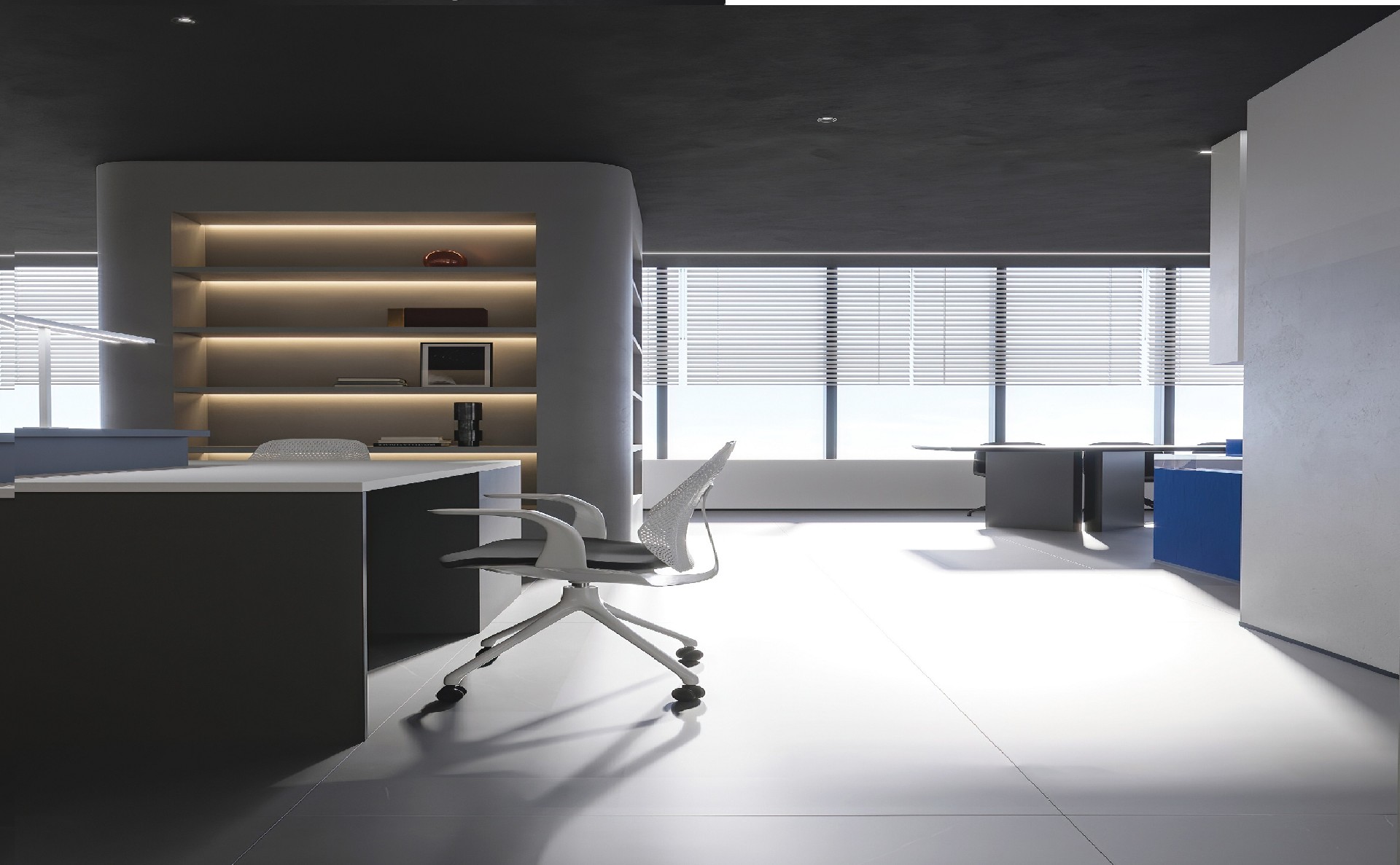 本案屬于簡(jiǎn)約的風(fēng)格,簡(jiǎn)單而有品位,色調(diào)冷暖結(jié)合。辦公環(huán)境的風(fēng)格取向、舒適與否對(duì)于提升員工的工作效率和體現(xiàn)企業(yè)文化起到至關(guān)重要的作用。辦公室整體色調(diào)采用藍(lán)灰調(diào),使員工辦公的心情能夠沉靜下來,工作效率自然可以得到提高。有一位建筑大師曾說過:“當(dāng)綠化、光和風(fēng)根據(jù)人的意念從原先自然中抽象出來,它們就趨向天堂”。我們?cè)谑覂?nèi)引入天光設(shè)置了自然植物,將室外的感覺引入室內(nèi)空間,使辦公環(huán)境更具活力。