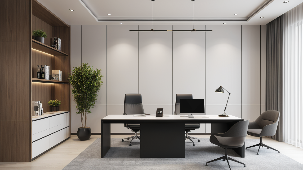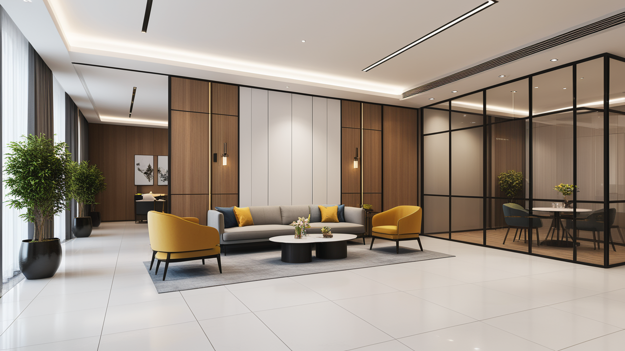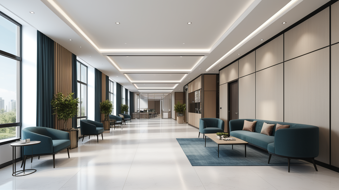 本案設(shè)計為突顯建筑開間較舒適之優(yōu)點,設(shè)計師特意設(shè)計了過道各柱體間鑲嵌不銹鋼條及玻璃幕墻上的磨砂條來點綴的裝修主題,同時,地面用拼花色帶打破,與方正而美觀的吊頂上下呼應(yīng);辦公室靠近走道的墻面,為將自然光透入走道,同時又加強其“靈透”感,采用清玻幕墻,幕墻上的磨砂條既打破了玻璃墻面的呆板,又提醒了行人幕墻的存在,防止無意識碰頭、沖撞等類似意外發(fā)生;為辦公室的后續(xù)私密性考慮,其清玻幕墻內(nèi)掛以百葉窗遮擋既可。