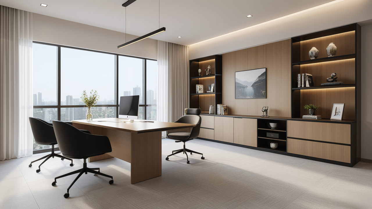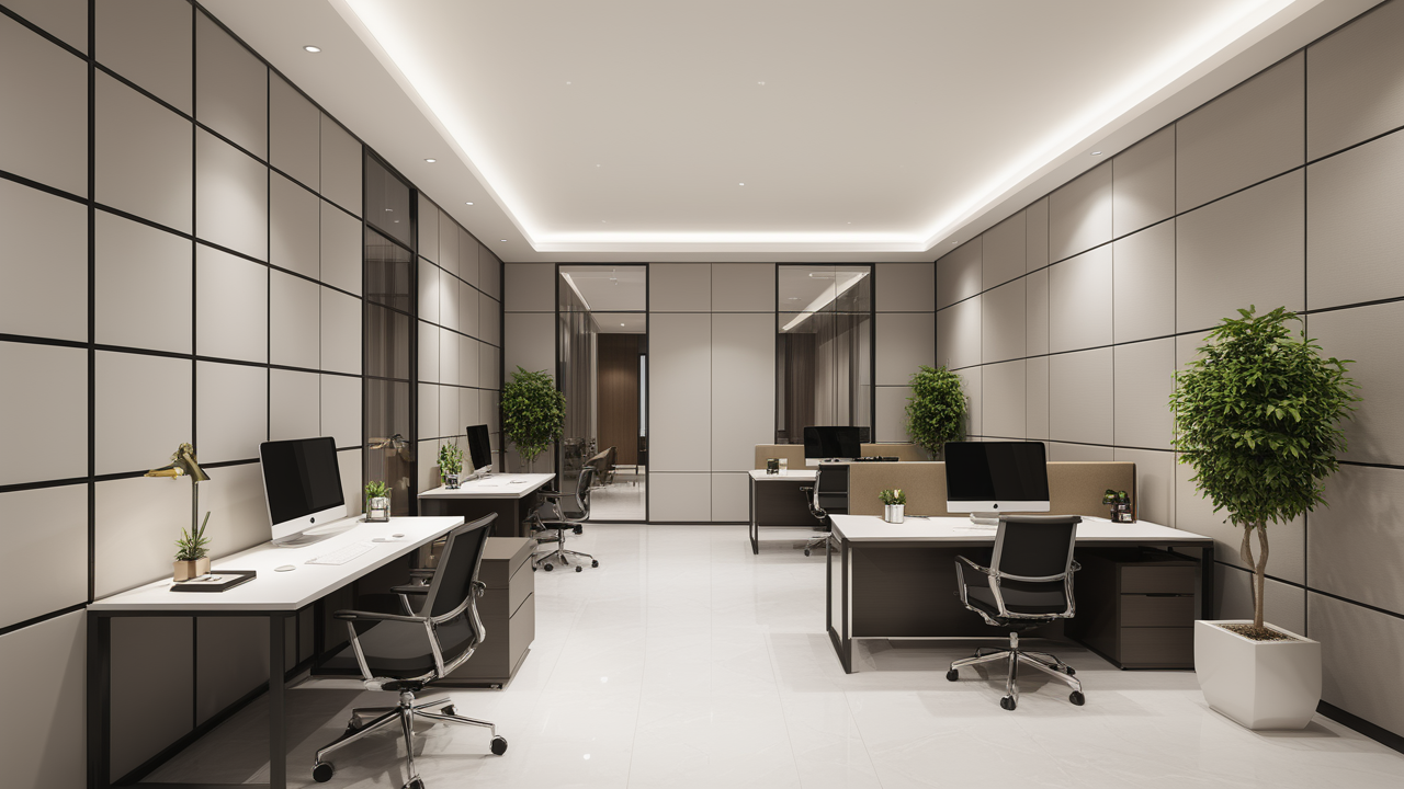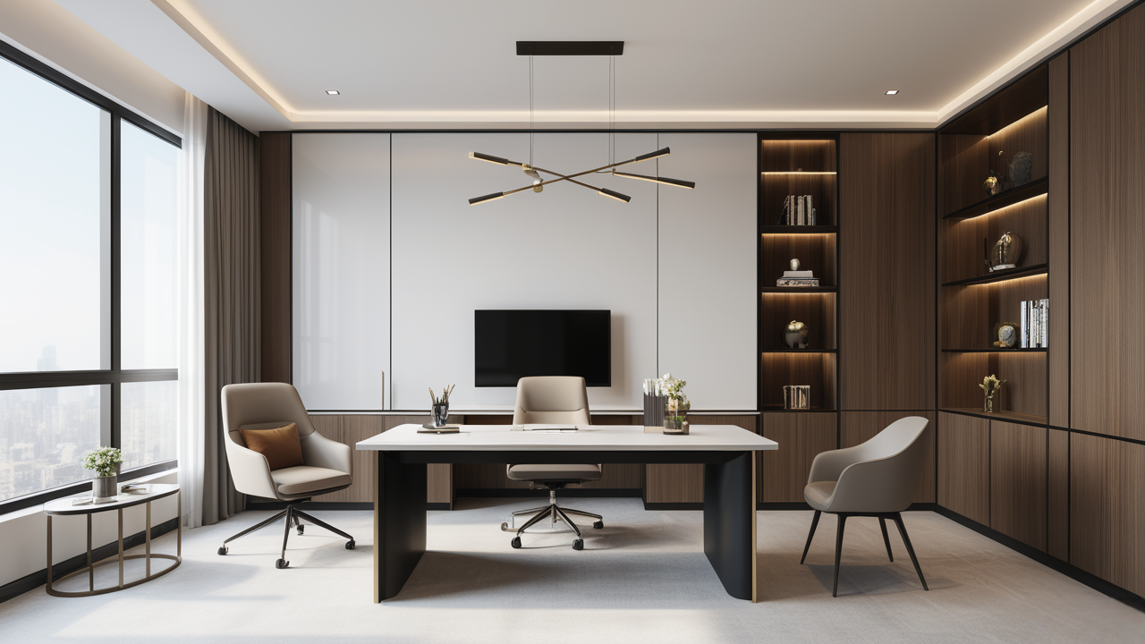 本案設(shè)計在處理上,特設(shè)計了可向客戶展示企業(yè)榮譽品的展示墻,用料實際,無須雕琢張揚,直線條的造型讓整個空間顯得穩(wěn)重大方,淺色系材料的運用延續(xù)了靈動而清澈的氣韻,大方莊重卻內(nèi)含現(xiàn)代時尚。而且色調(diào)淡雅的地毯、沙發(fā)、背景,還突出了接待廳親切、和睦、寬松的氛圍,使穩(wěn)靜而坦誠的晤談氣氛盎然一室。