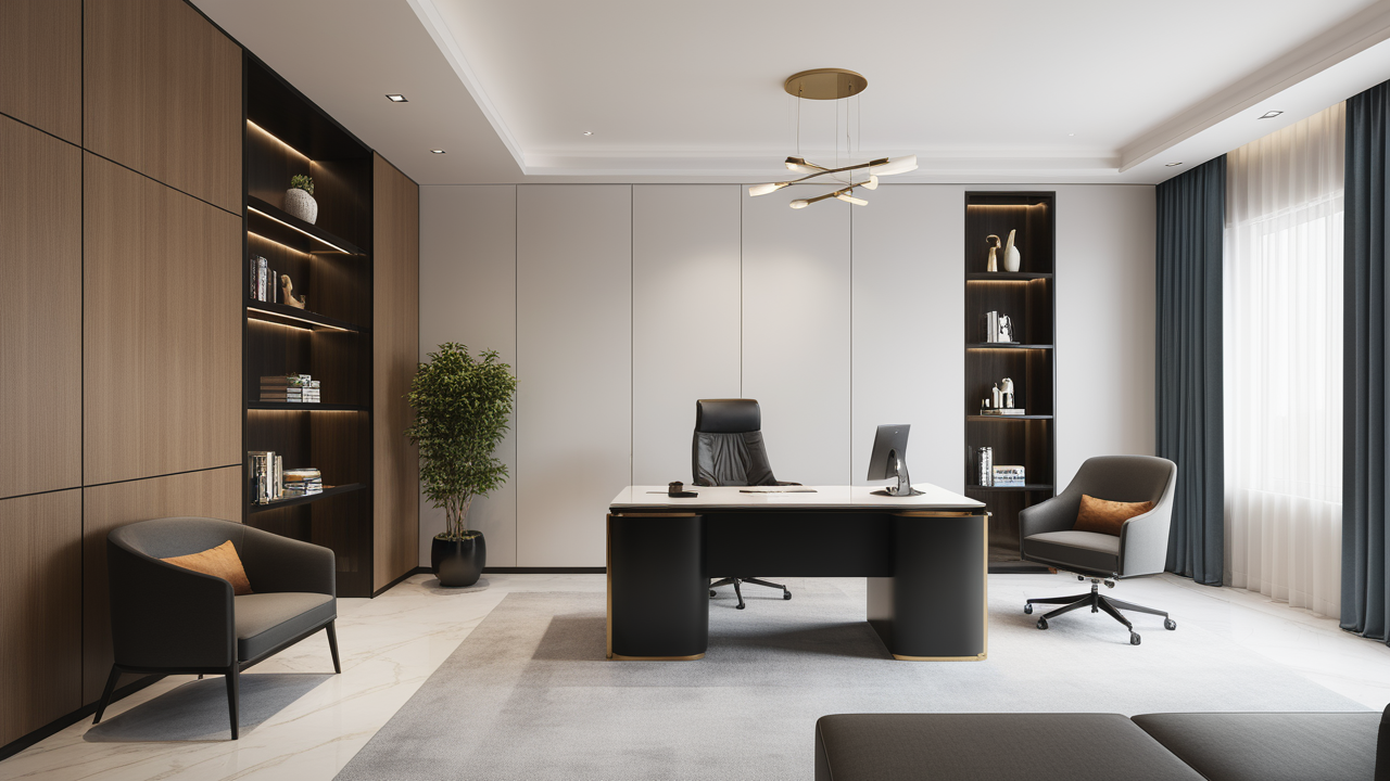 本案設(shè)計(jì)在處理上,特設(shè)計(jì)了可向客戶展示企業(yè)榮譽(yù)品的展示墻,用料實(shí)際,無須雕琢張揚(yáng),直線條的造型讓整個(gè)空間顯得穩(wěn)重大方,淺色系材料的運(yùn)用延續(xù)了靈動(dòng)而清澈的氣韻,大方莊重卻內(nèi)含現(xiàn)代時(shí)尚。而且色調(diào)淡雅的地毯、沙發(fā)、背景,還突出了接待廳親切、和睦、寬松的氛圍,使穩(wěn)靜而坦誠的晤談氣氛盎然一室。