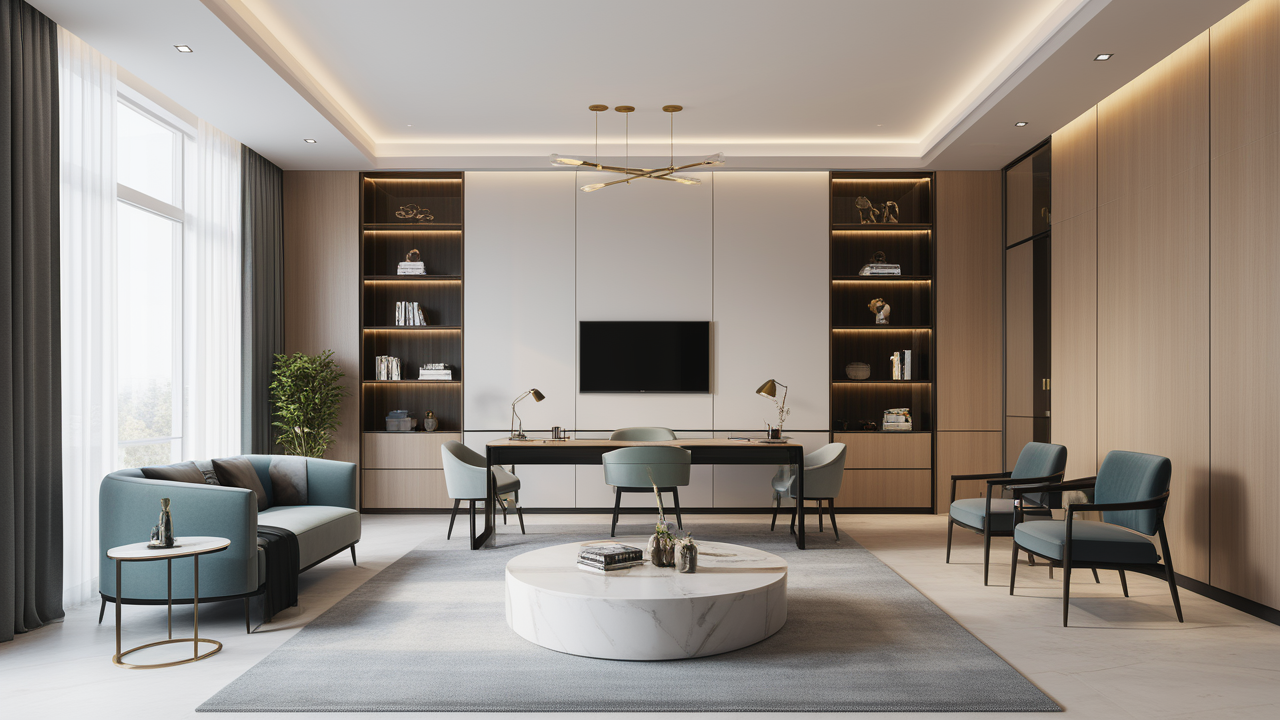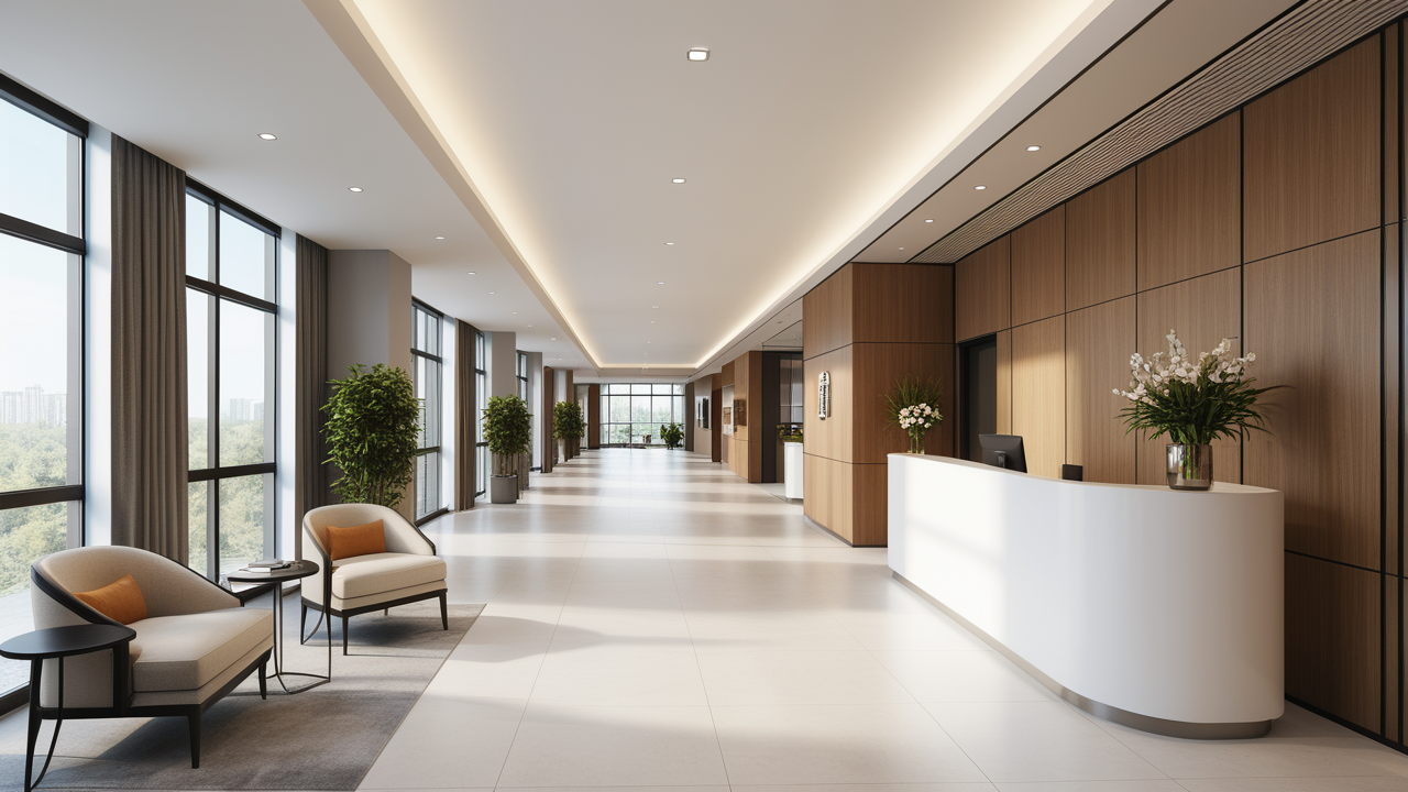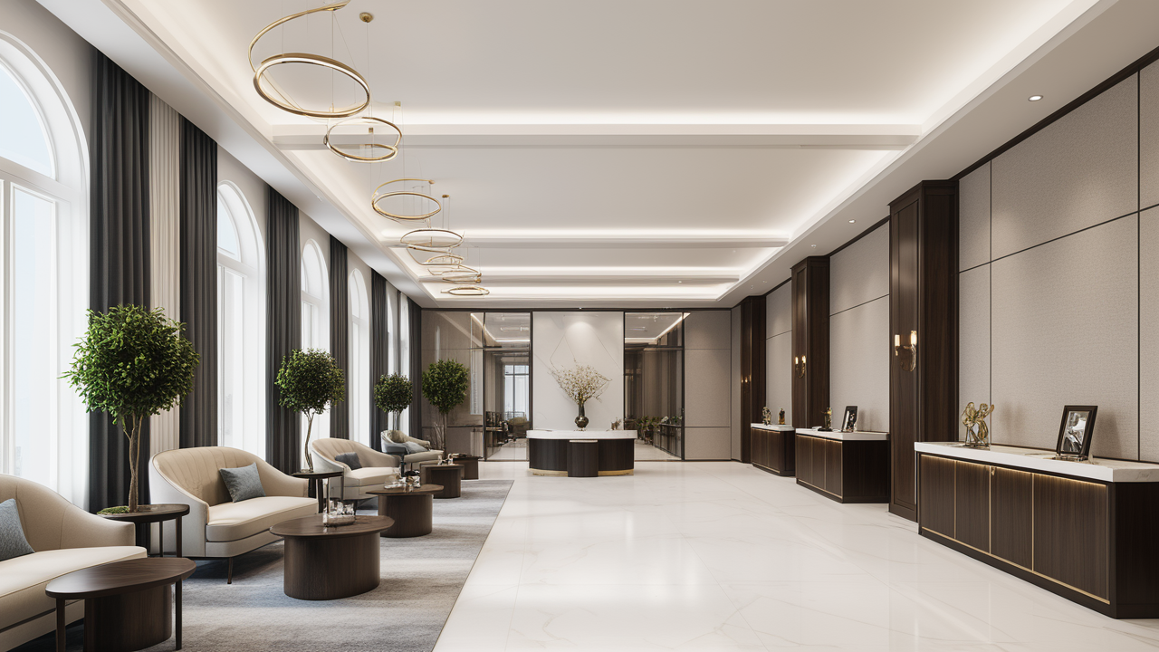 本案設(shè)計(jì)首先闖入眼簾的是企業(yè)形象墻,以其企業(yè)文化的新興、蓬勃、嚴(yán)謹(jǐn)為主題,兩側(cè)以“居有竹、步步高”的銀色墻柱帶來(lái)視覺(jué)沖擊感,加上企業(yè)形象色的類比色、淺色石材及不銹鋼條的運(yùn)用,顯示出金屬的質(zhì)感和工業(yè)文明的主題;華堂上方呼應(yīng)以直線為主調(diào)、大筆勾勒而出的時(shí)尚型弧面吊頂,大直大方顯示出強(qiáng)烈的縱深感,加之以清透、明媚的光色渲染,工整氣派、大家風(fēng)范,反襯出貴公司辦公樓的現(xiàn)代時(shí)尚特性,以干練快捷的設(shè)計(jì)節(jié)奏,展示出質(zhì)量與效率并舉的時(shí)代精神。