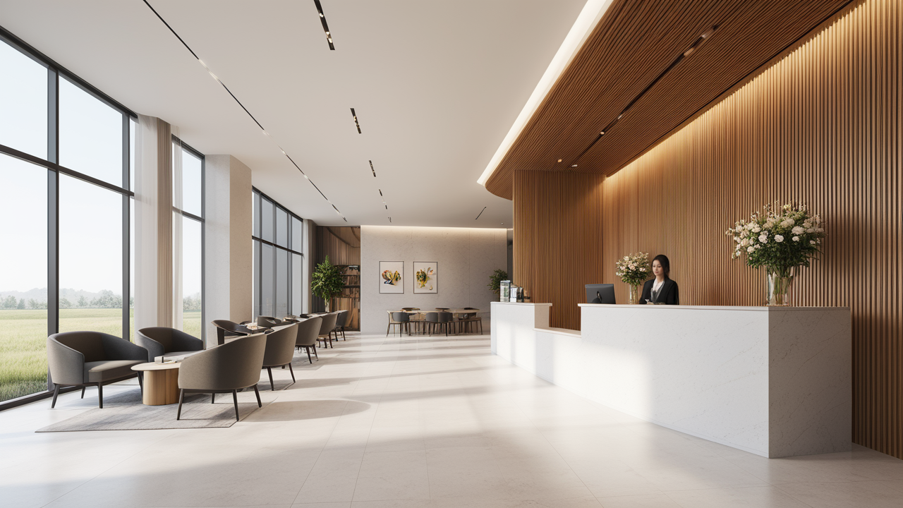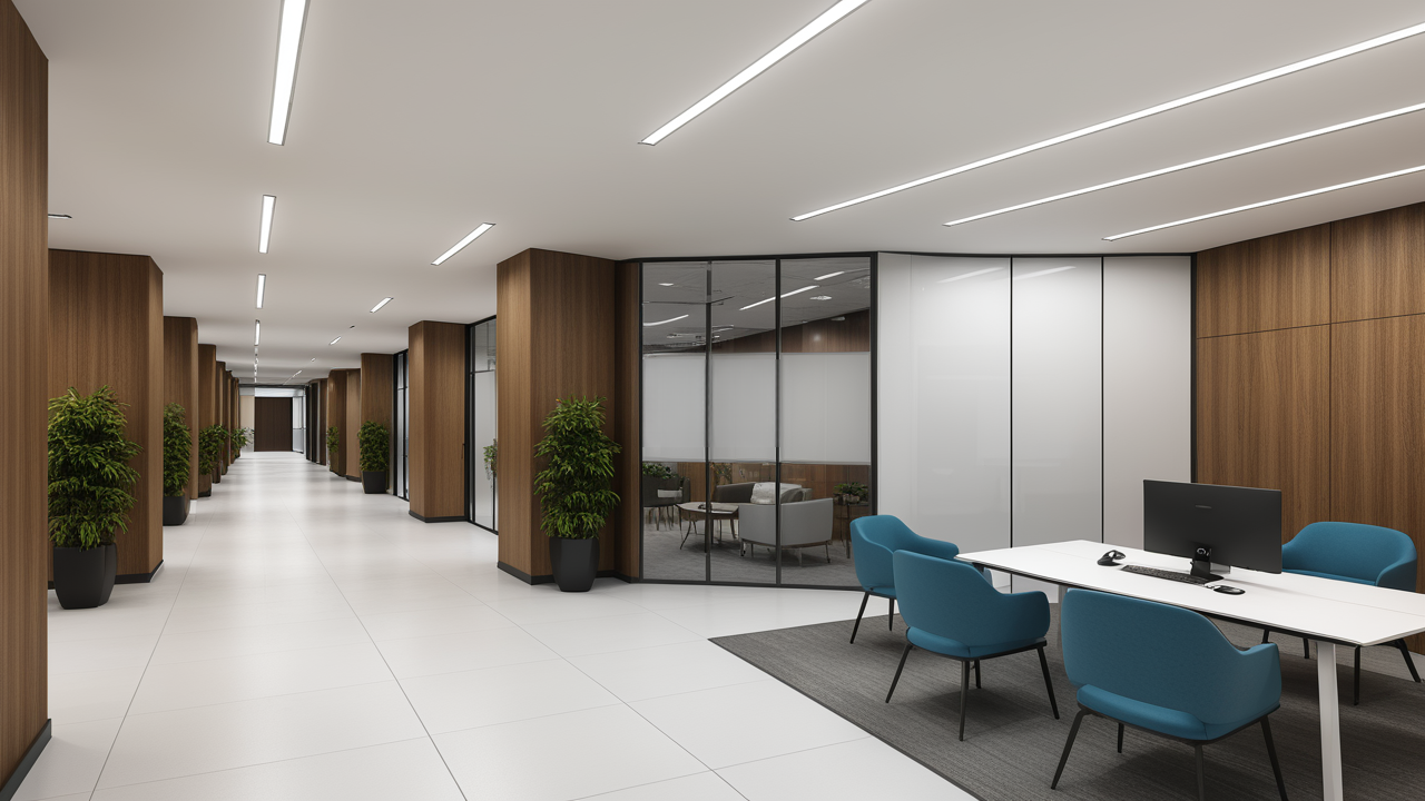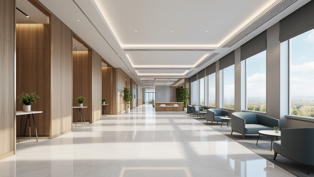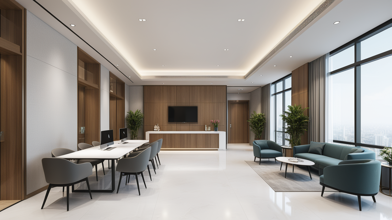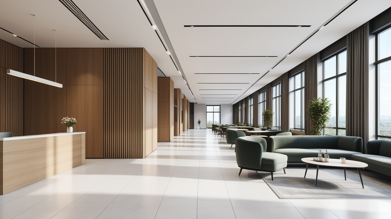 本案設(shè)計為突顯建筑開間較舒適之優(yōu)點,設(shè)計師特意設(shè)計了過道各柱體間鑲嵌不銹鋼條及玻璃幕墻上的磨砂條來點綴的裝修主題,同時,地面用拼花色帶打破,與方正而美觀的吊頂上下呼應(yīng);辦公室靠近走道的墻面,為將自然光透入走道,同時又加強(qiáng)其“靈透”感,采用清玻幕墻,幕墻上的磨砂條既打破了玻璃墻面的呆板,又提醒了行人幕墻的存在,防止無意識碰頭、沖撞等類似意外發(fā)生;為辦公室的后續(xù)私密性考慮,其清玻幕墻內(nèi)掛以百葉窗遮擋既可。