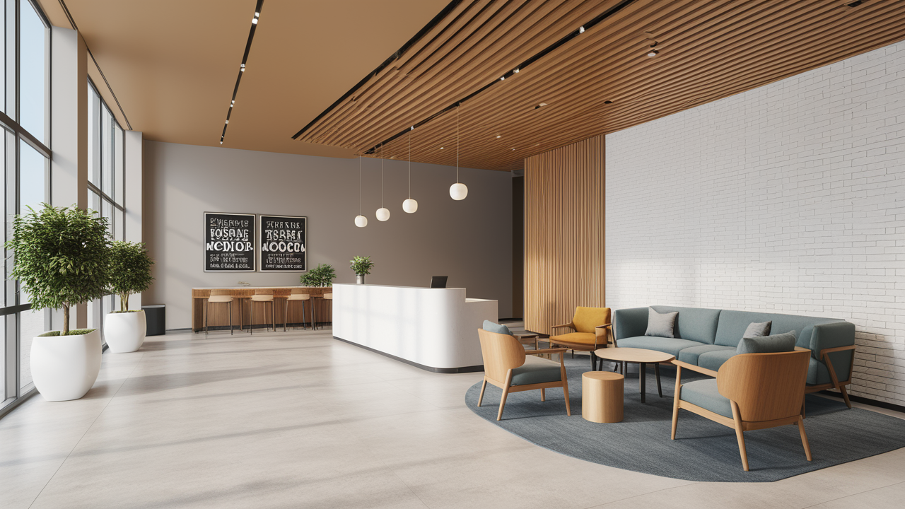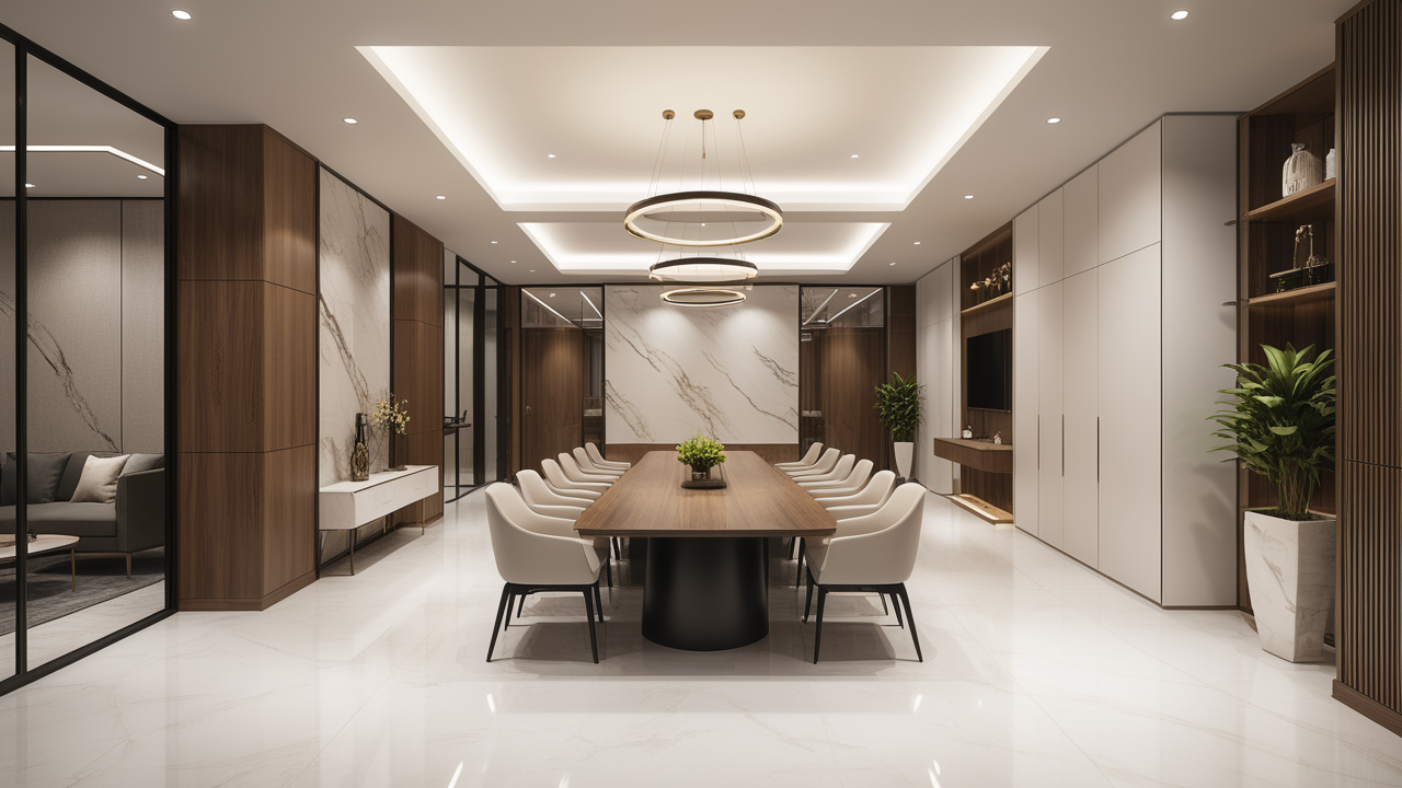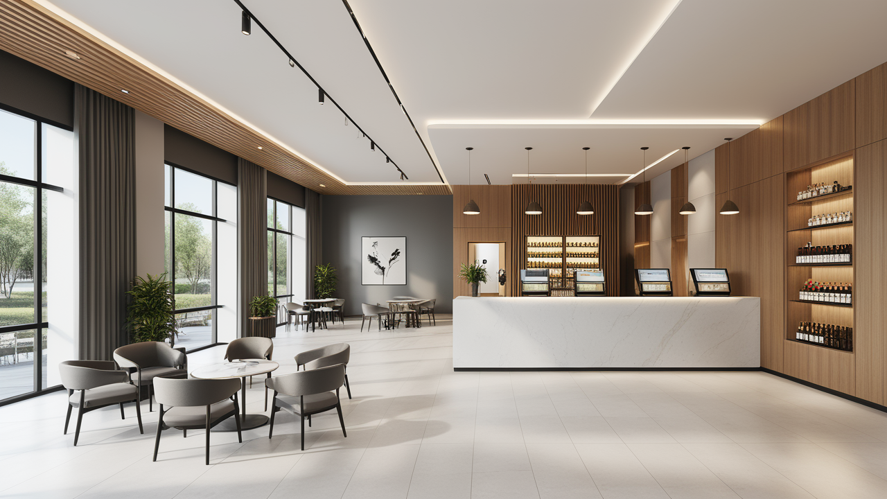本案在設計中采用環(huán)環(huán)相扣的圓弧頂面造型,層層遞近的燈具圍繞圓型屋頂向外拓展,突出空間的立體造型感,也使天花燈飾顯出碧玉般通透潤澤的光影。設計成舞臺平臺的主席臺具備多功能的特點,可兼顧各類舞臺表演及大型會場會議的組織。粗曠沉穩(wěn)的圓形大立柱及方柱,頗具雄偉之勢,但是考慮到其在大型場地內(nèi)的阻礙性問題,故不將此做再多修飾,僅僅以真石漆的噴涂來達到既不擴大柱圍又美化柱體的作用;地面以座位的安排為向?qū)?,輔以簡易直紋拼花來點綴。
